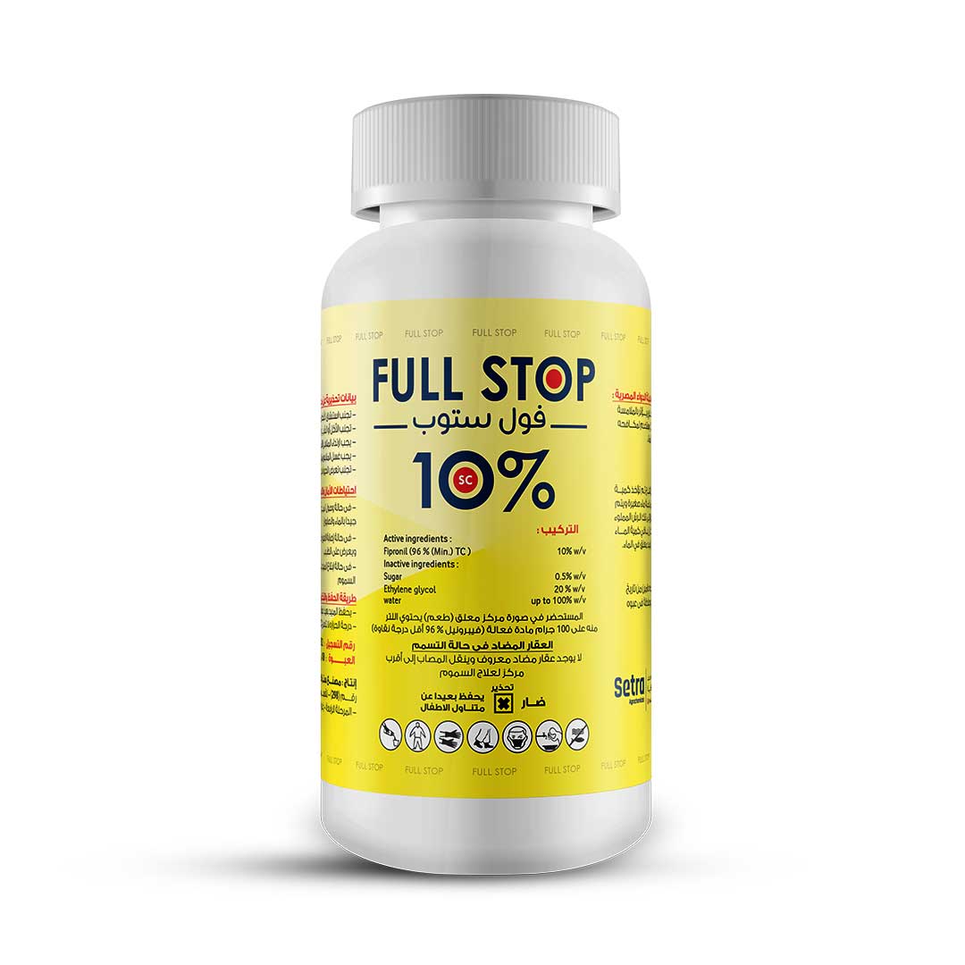 FULL STOP is an insecticide of the Phenyl pyrazoles group, which has a contact and ingestion effect, this product acts on the central nervous system of insects. It is an insecticide of very low toxicity to mammals and for users, it has a very good residual stock and provides an effective pest control. Insects cease their activity immediately after coming into contact with FULL STOP.